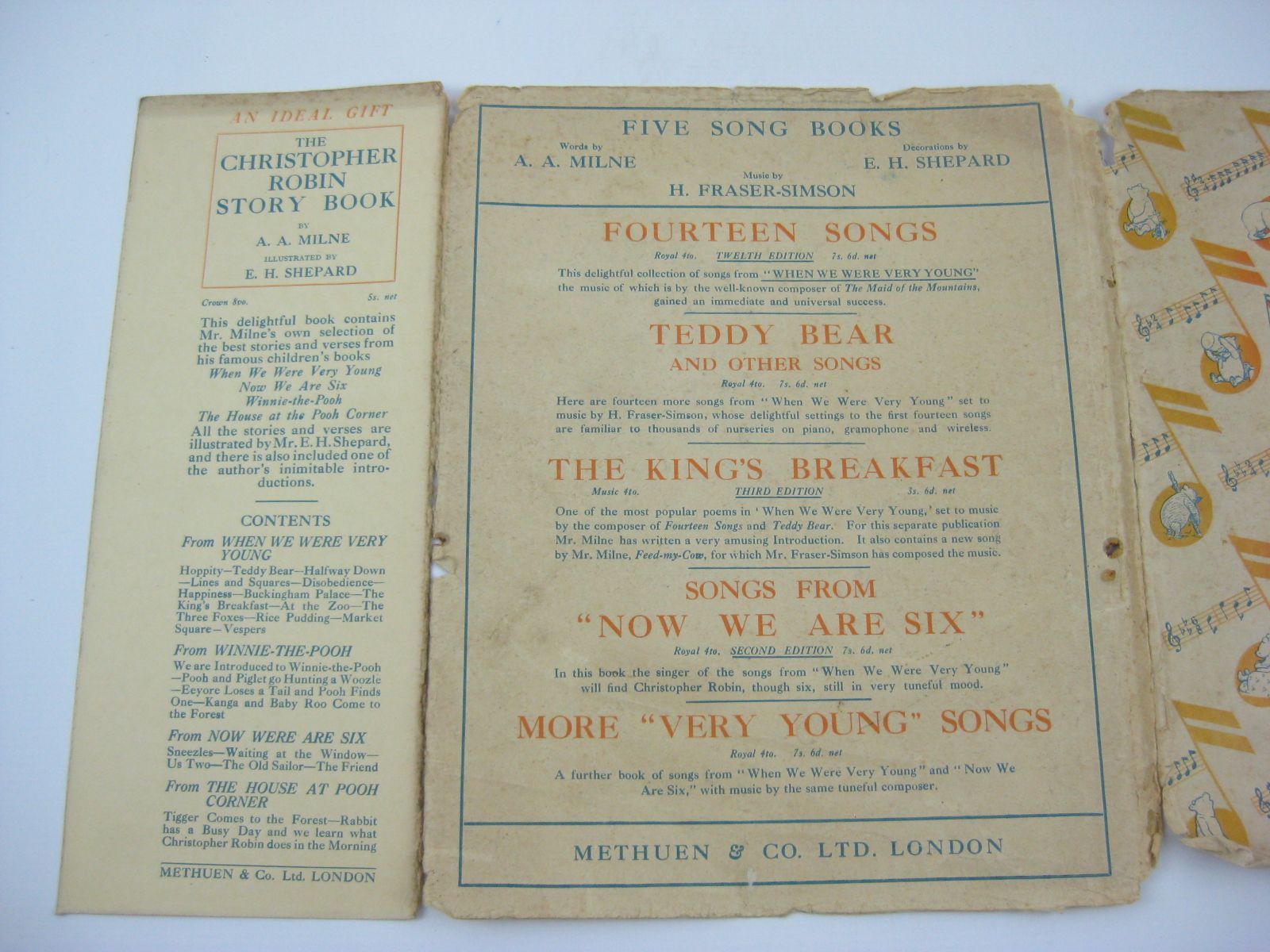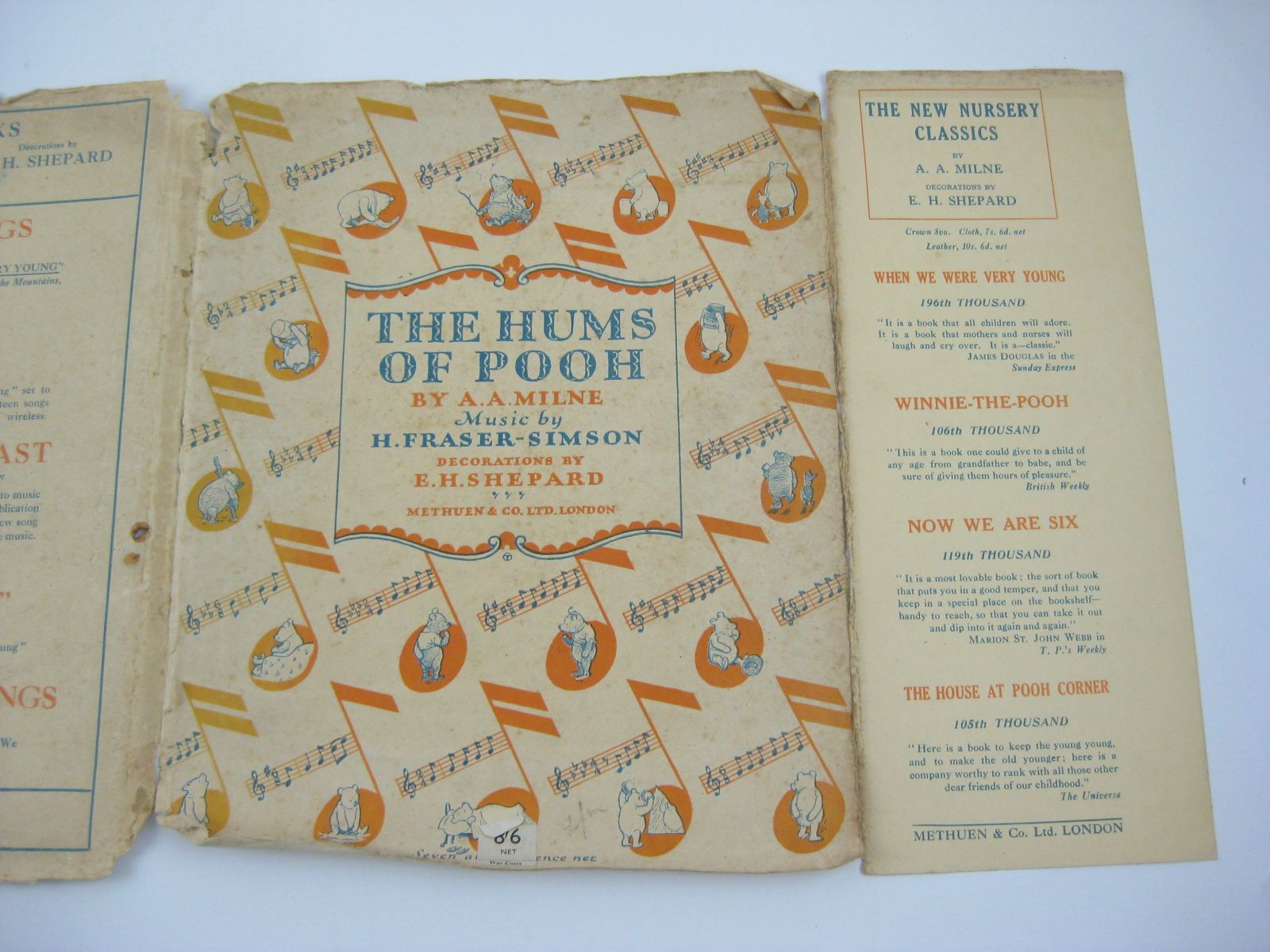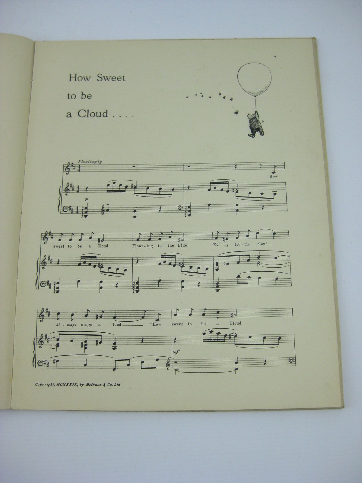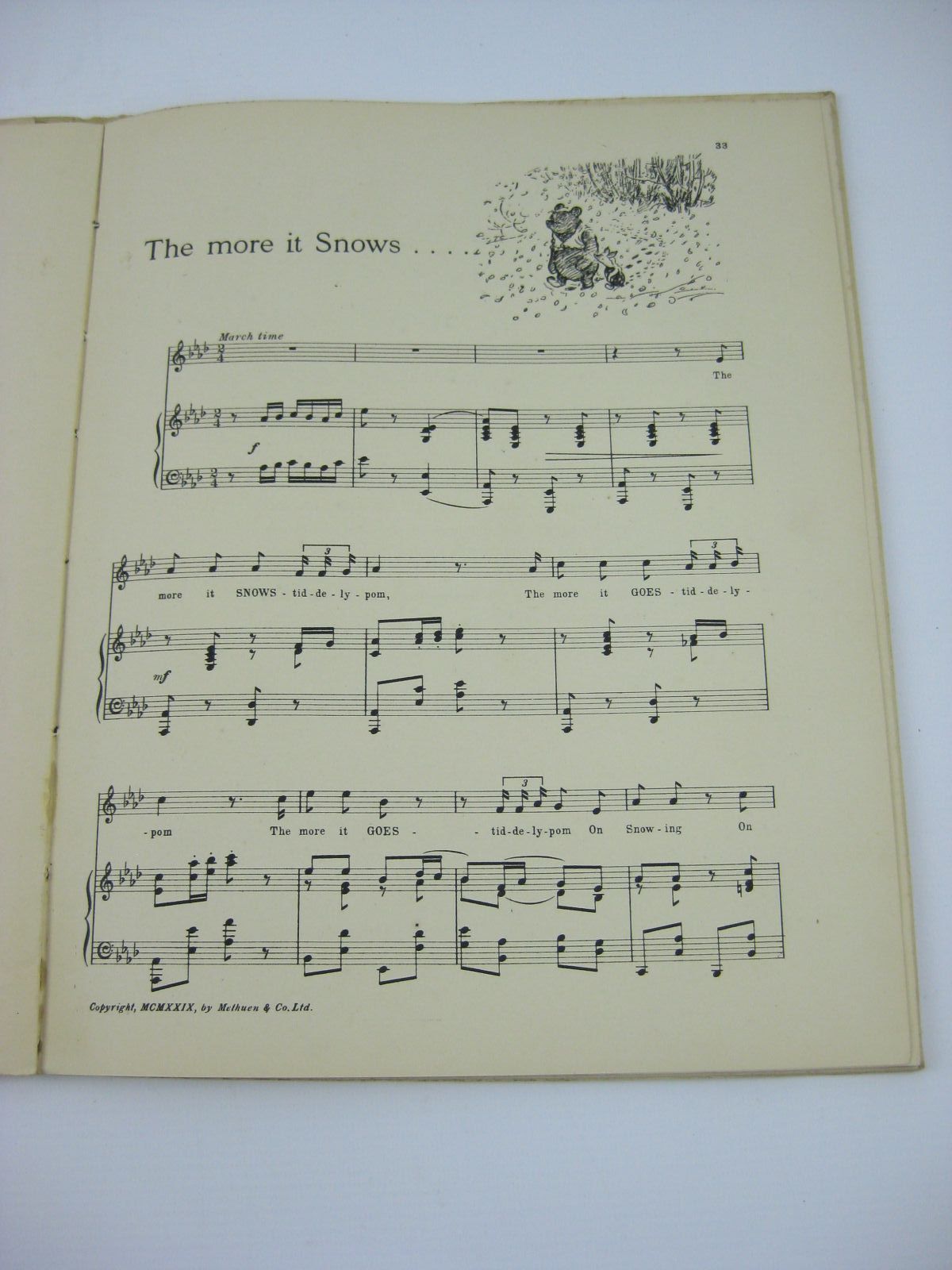 Slightly better than good condition in a good dustwrapper. Large format Beige cloth spine. Green and beige pictorial upper board. A selection of Pooh Bear's lyrics from Winnie-The-Pooh and The House at Pooh Corner, set to music by H. Fraser-Simson. B/w text illustrations by the famous Pooh Bear illustrator, E.H.Shepard.