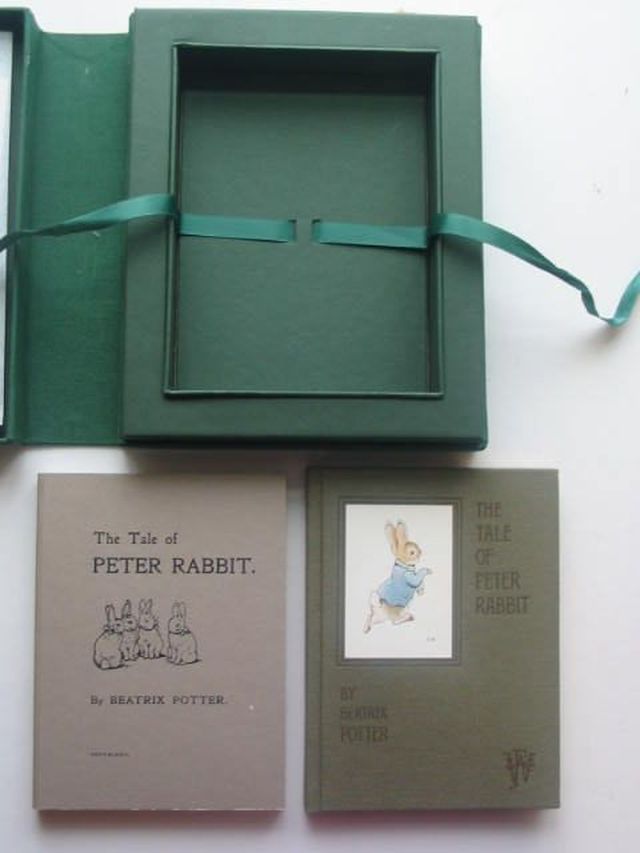 Fine condition. Special Limited edition boxed set, (limited to 1175 copies); issued to commemorate the 100th anniversary of the publication of The Tale of Peter Rabbit. This commemorative box contains facsimiles of the three stages in the publication of this title: the picture letter Beatrix Potter first wrote to Noel Moore in 1893, her own privately-printed volume of 1901 (the first printing), and the original deluxe edition published by Frederick Warne in 1902 (olive binding). A small stapled pamphlet on the history of publication is included, as is a gilt embossed tissue guard to protect the limited edition plate on the interior of the box. The box is dark green cloth with a brass latch and has a gilt title to spine. A beautiful edition for the collector!