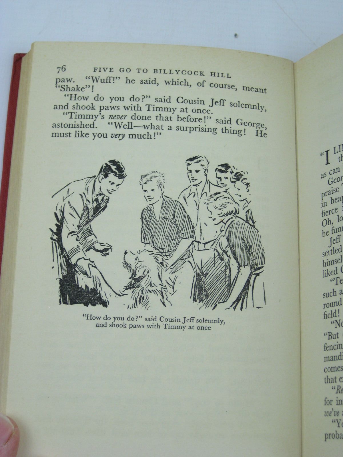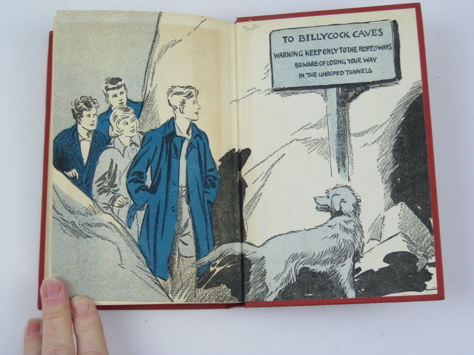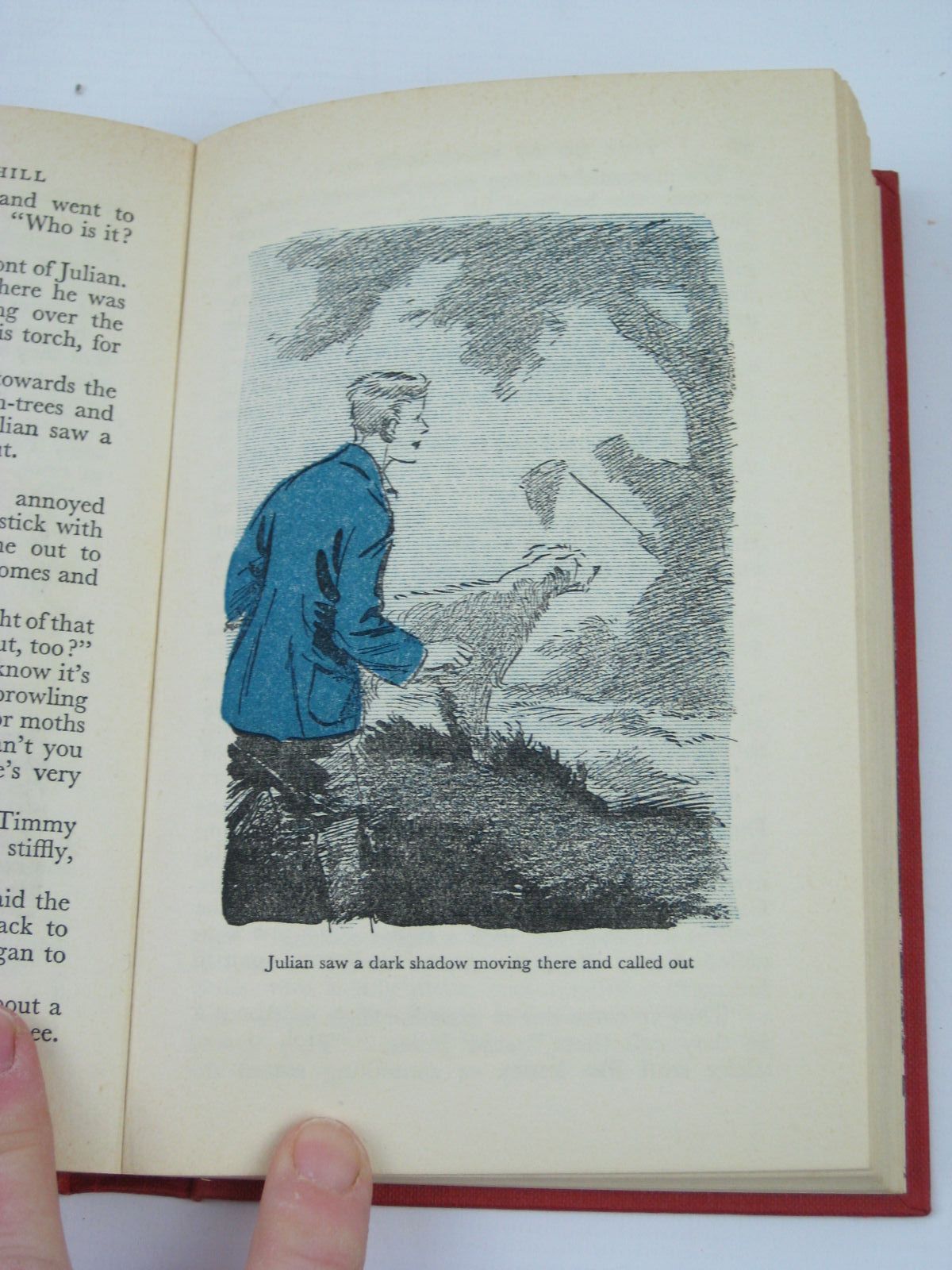 Very good condition in a almost very good dustwrapper. The sixteenth book about the Famous Five. Red boards, black titles. Blue pictorial endpapers. Two-tone and b/w illustrations. 182 pages.