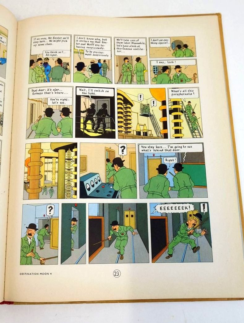 Very good condition. Young reporter Tintin and his friend Captain Haddock receive an invitation from Professor Calculus to come to Syldavia, where Calculus is working on a top-secret project in a secure government facility to plan a crewed mission to the Moon. Large format. Red cloth spine, blue pictorial boards. Colour cartooon strip illustrations. 61 pages.
