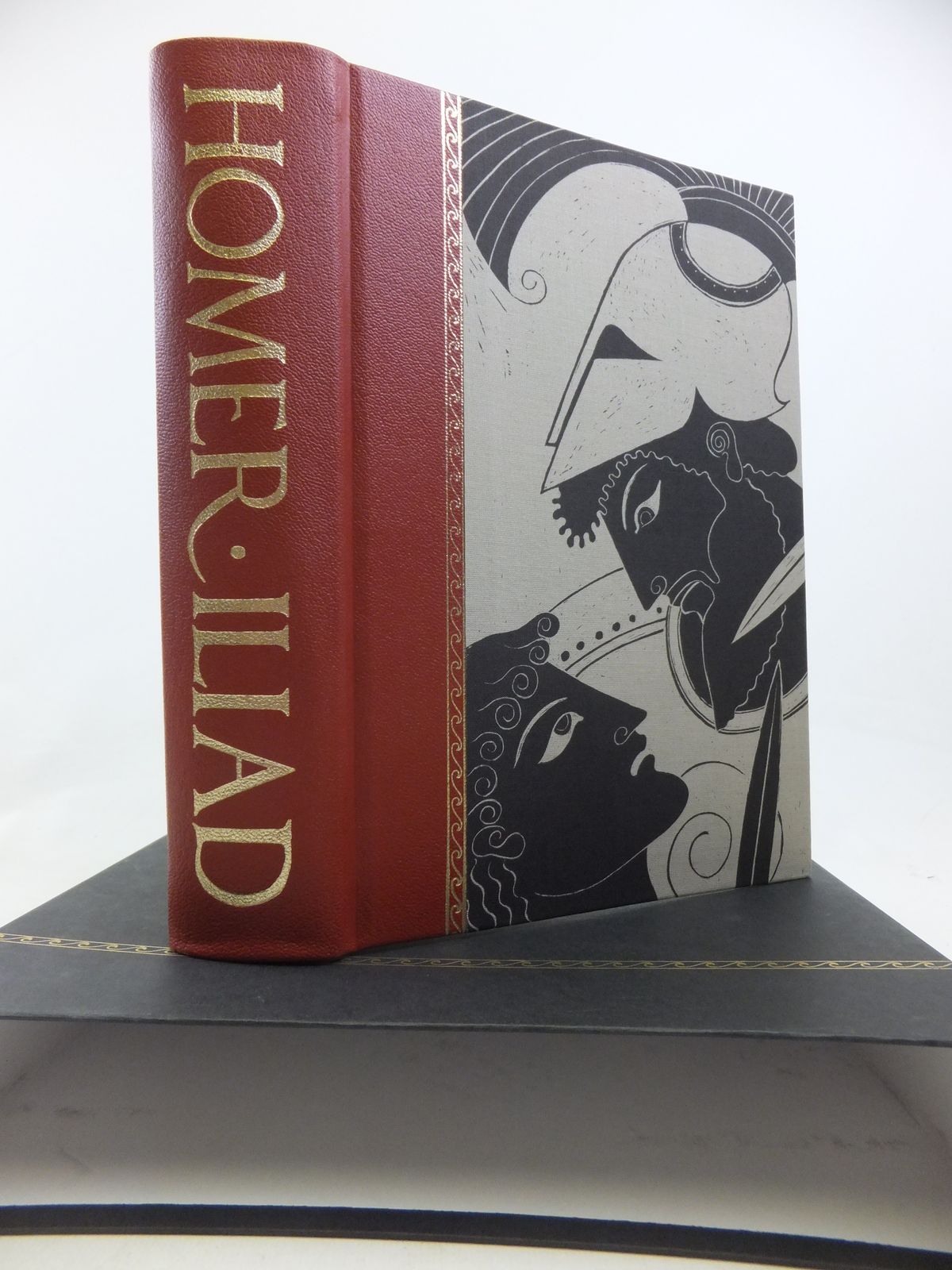 Nearly fine condition. Robert Fagles' translation of The Iliad. Introduction and notes by Knox. Brick red leather spine with gilt title, beige cloth boards with blocked design. Colour plates. Top edge red. lxxxv and 596 pages.