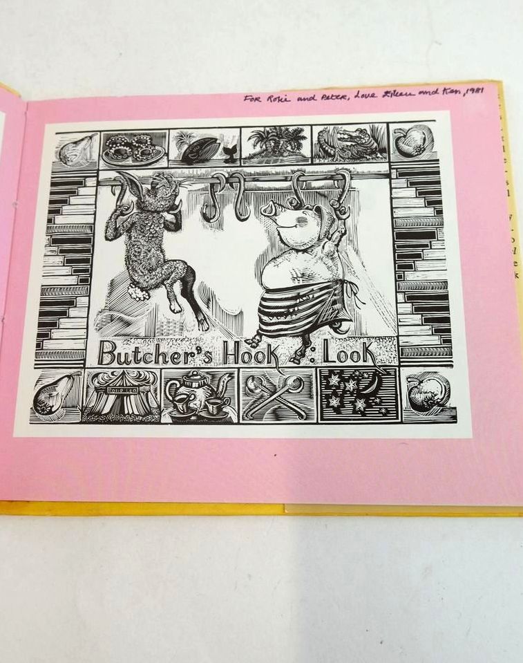 Very good condition in a very good dustwrapper. 'Rabbit and Pork' stands for 'rhyming talk' or Cockney rhyming slang, the unique language with its famous phrases suchas 'plates of meat' (feet) and 'bees and honey' (money). A collection of fifty different phrases, all illustrated with a coloured wood engraving. Oblong format. Matt pictorial boards. Unpaginated.
