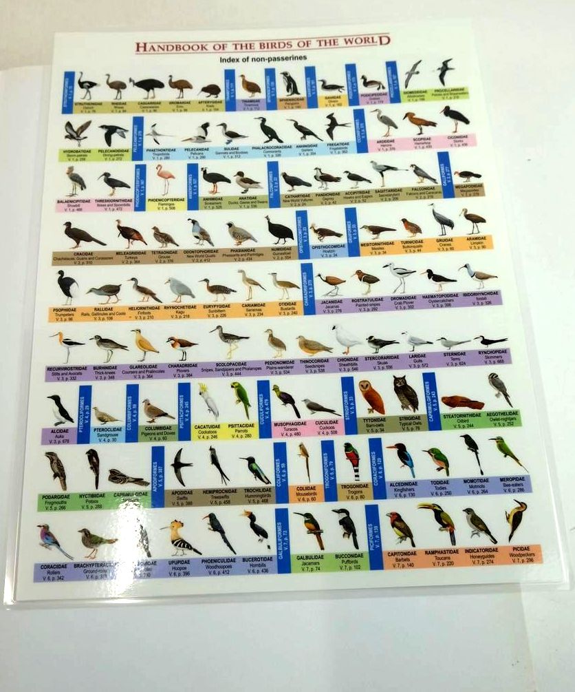 Minor mark to front board and light bump to lower corner of front board. Else boards clean. Minor foxing to top of text block. A few grubby marks to prelimms else contents clean. White pictorial dustwrapper has a few minor marks. Includes laminated alphabetical list of Non-passerines loosely inserted. Overall, a very nice copy.