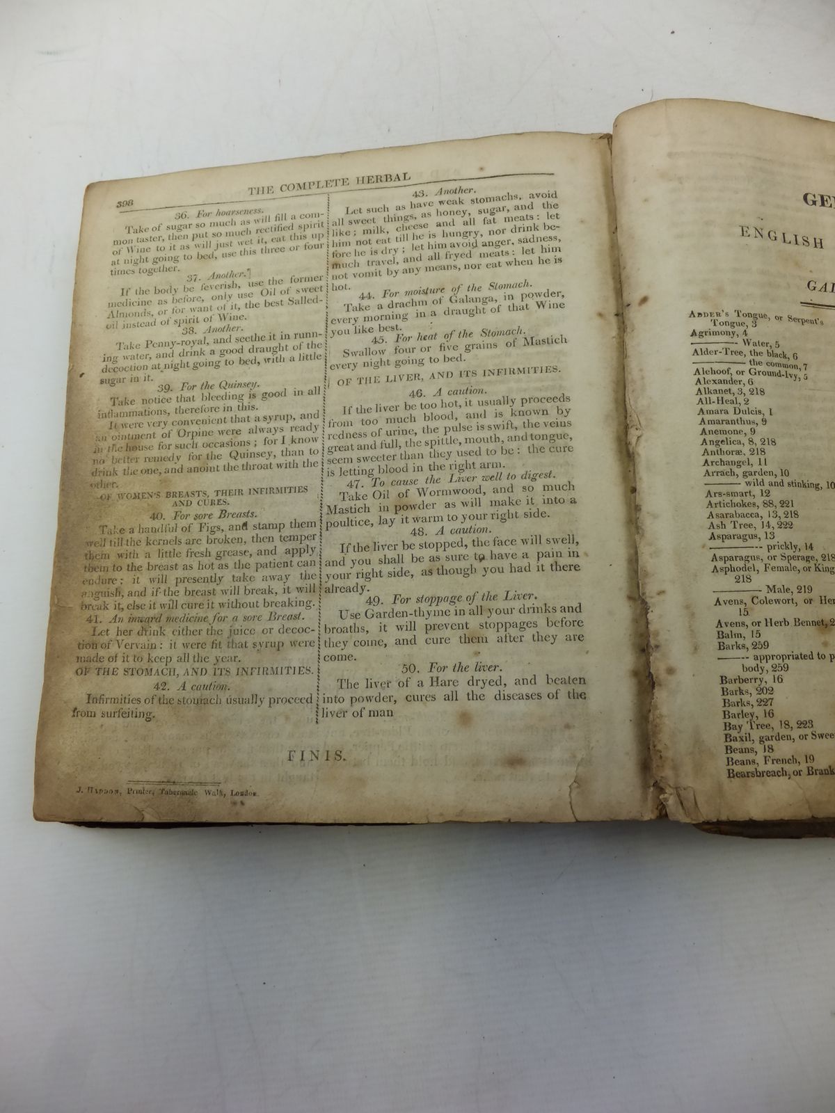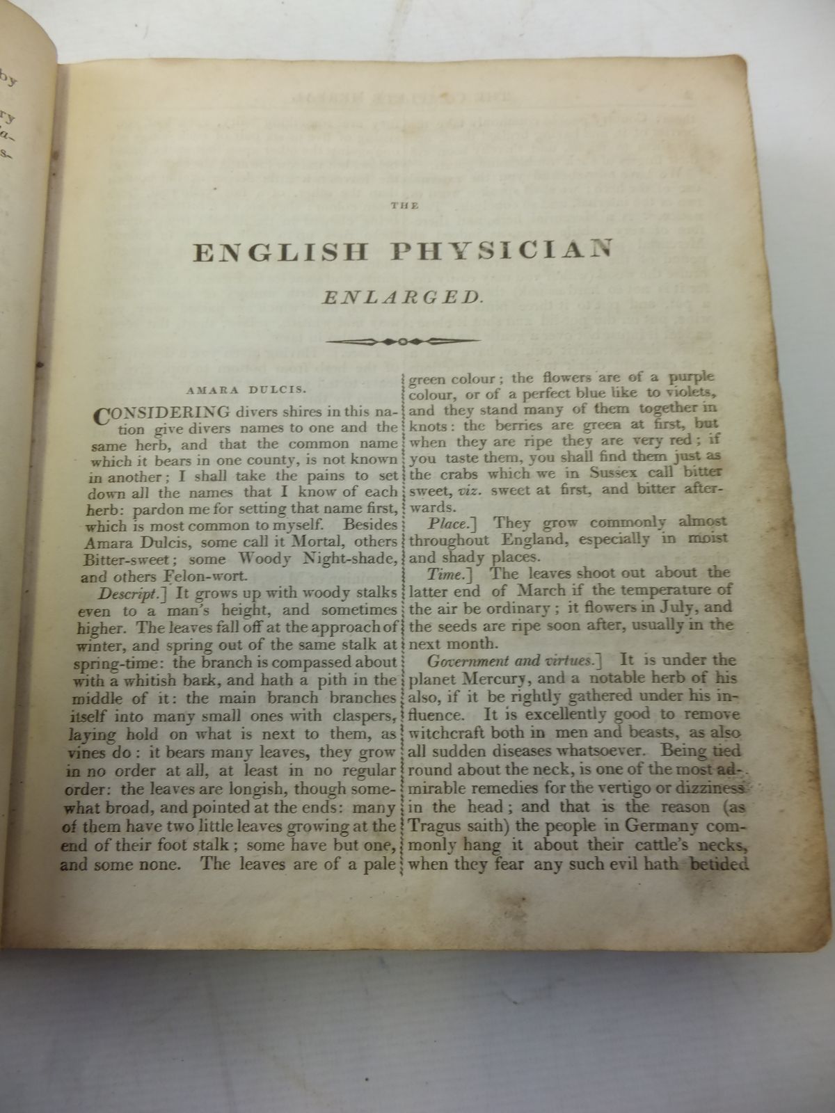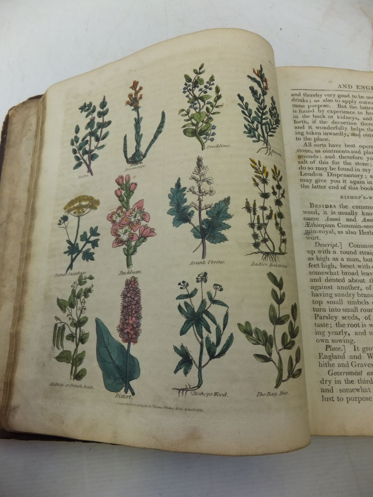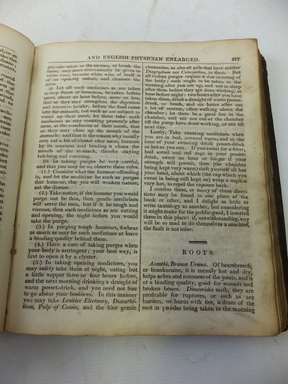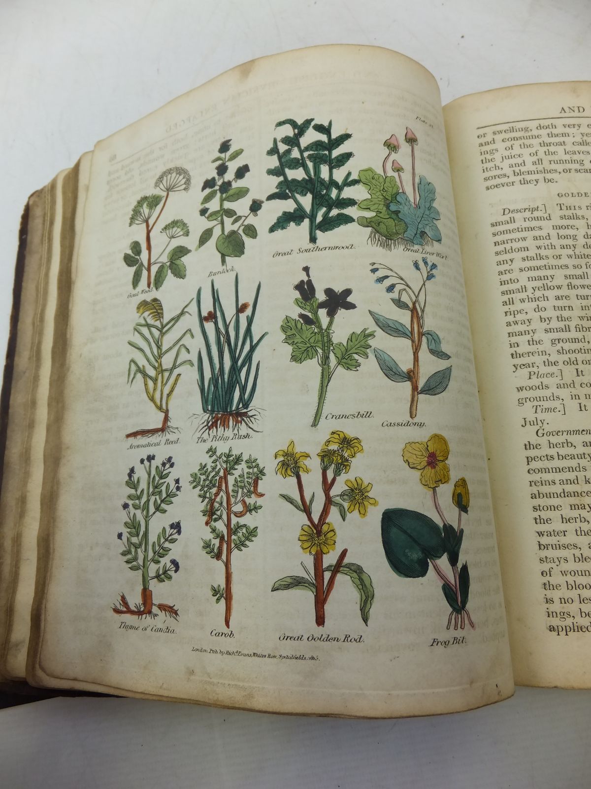 Fair condition. '...To which is now added, upwards of one hundred additional herbs, with a display of their medicinal and occult qualities; physically applied to the cure of all disorders incident to mankind. To which are now annexed his English Physician Enlarged, and Key to Physic, with rules for compounding medicine according to the true system of nature. Forming a complete dispensatory, and natural system of physic, to which is also added upwards of fifty choice receipts, selected from the author's last legacy to his wife. Embellished with engravings of upwards of four hundred different plants, with other subjects to illustrate the work.' Large format. Full leather binding with raised bands to spine and gilt title on burgundy title label. 40 hand-coloured plates. vi and 398 pages plus index.
