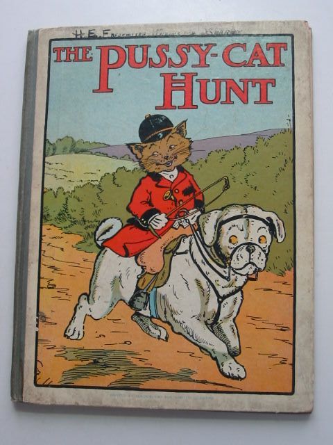 Good condition. Pictures and Verses for Little Folk. Blue/grey cloth spine with pictorial paper boards. Front board shows pussy in hunting clothes riding a white dog with red title at top. 4 colour plates, b/w illustrations.