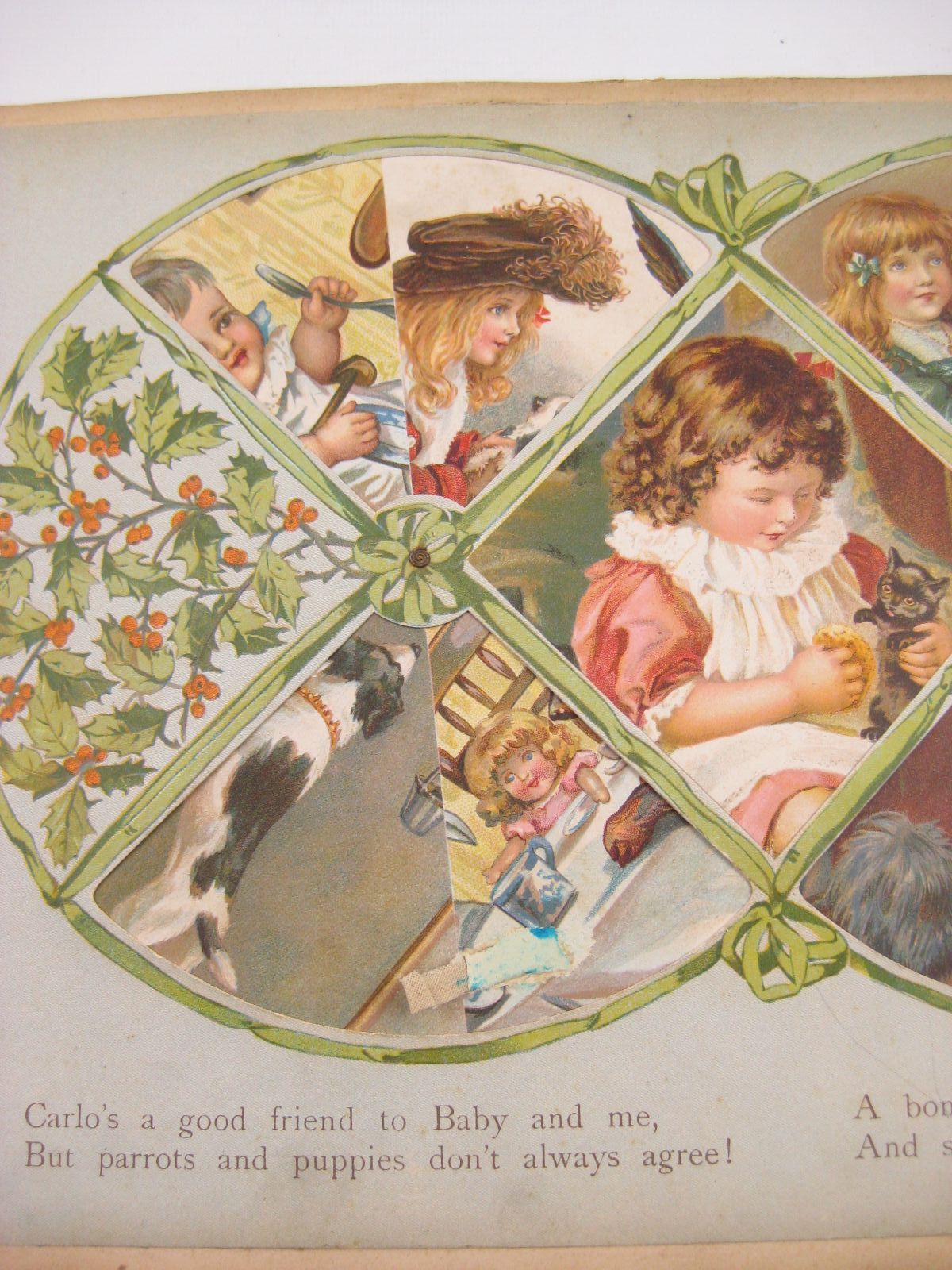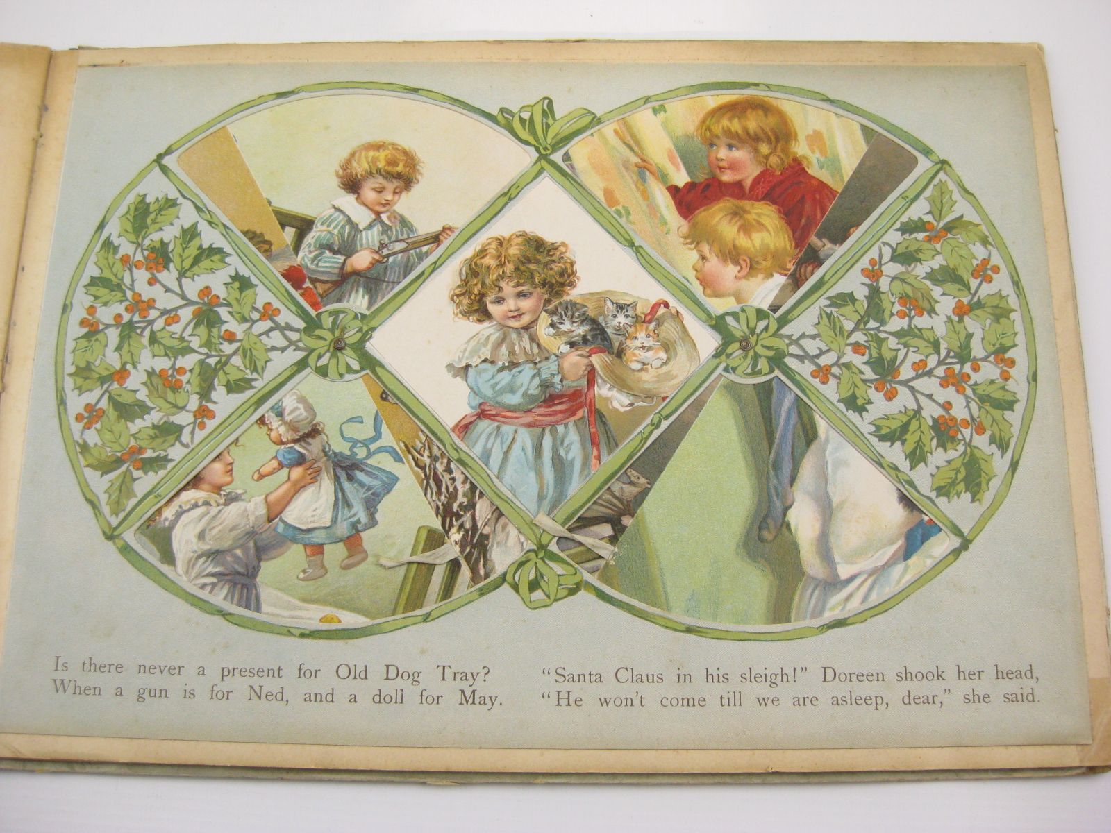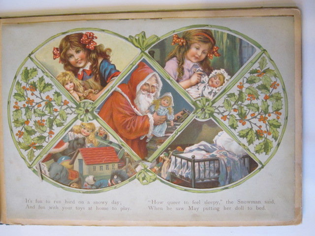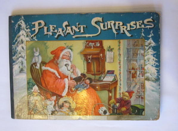 Good condition. Large oblong format. Blue cloth spine. Pictorial front board shows Father Christmas with toys, sitting and speaking on the telephone. 6 moveable scenes, each opposite a page of verse.