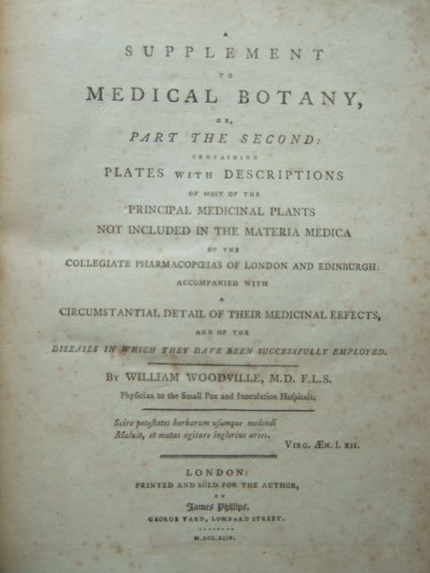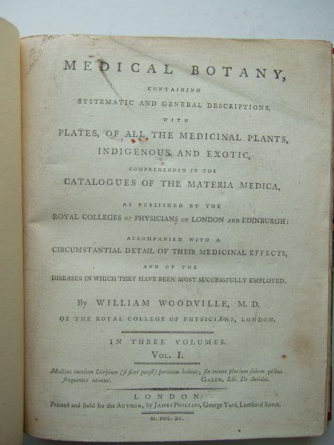 Very good condition. Containing Systematic and General Descriptions, with Plates of all the Medicinal Plants, Indigenous and Exotic, Comprehended in the Catalogues of the Materia Medica, as Published by the Royal Colleges of Physicians of London and Edinburgh, accompanied with a circumstantial detail of their medicinal effects and of the diseases in which they have been most successfully employed. 3 volume set, plus a further volume of Supplement. Matching modern leather bindings with leather boards, raised bands to spines; title labels to spines. 274 b/w engraved plates.