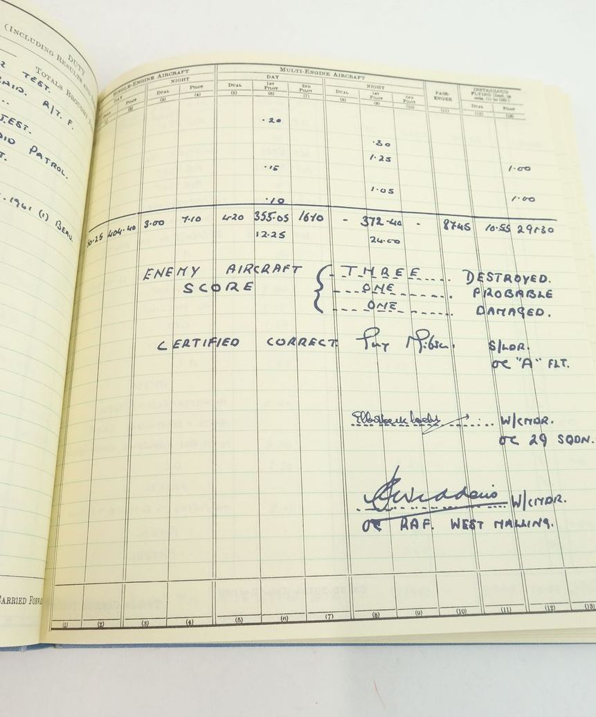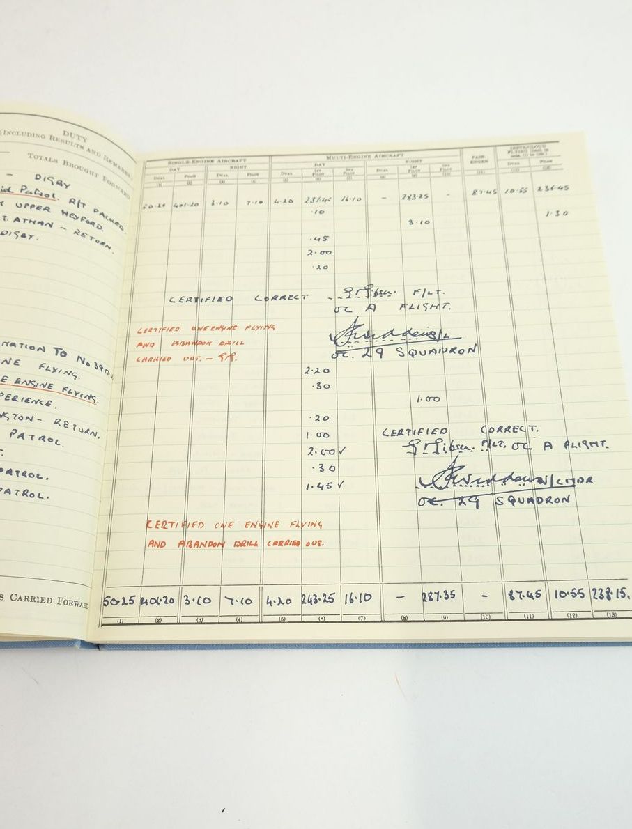 Very good condition. Blue cloth boards, black title. An exact facsimile reproduction of the Flying Log Book of Wing Comander Guy Gibson, VC, DSO, DFC. The written entries end on September 16, 1944.