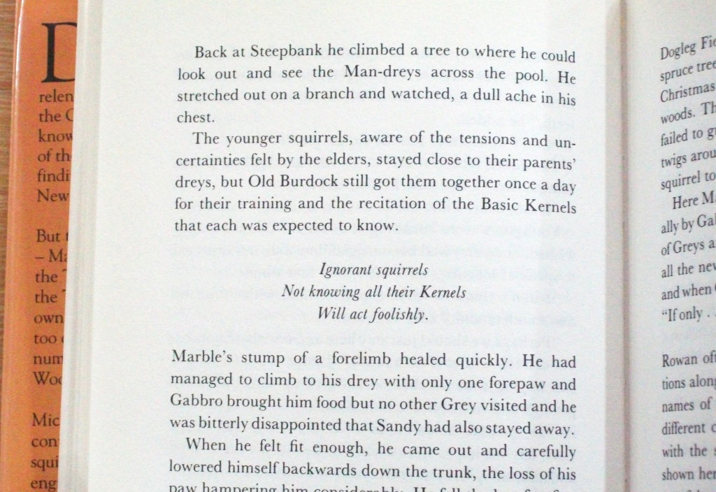 I have a soft spot for animal stories, particularly those like Duncton Wood by William Horwood and Watership Down by Richard Adams, where the animals are portrayed acting like animals. I am less keen on the stories where the animals act like humans – wearing waistcoats, jackets and smoking pipes for example. This book falls into the former category and Tod offers us a fully developed, imagined world in his book. For example, the red squirrels have a folklore that they live by, which is remembered by bits of squirrel wisdom called ‘Kernal’s’. Each kernal works as an arrangement of sounds, five, then seven, then five. For example: