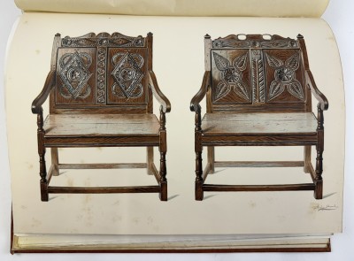 The first volume in the series is “The Age of Oak”. This comprises furniture dating from 1500-1660 that can be attributed to the Renaissance and its evolution from the Gothic. It’s interesting that design in architecture and furniture in the Middle Ages was wholly due to the influence of the church. The author notes that early furniture was severe in character with a practical necessity for its solidity, as “a man armed cap-à-pie [head to foot] must have required a very heavily constructed seat”!