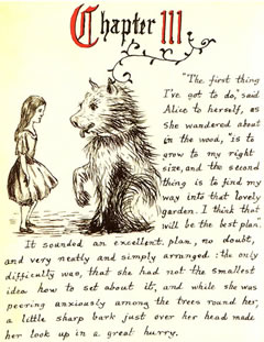 Fairy tales and fantasy reached their culminating point of triumph with the publication of Alice’s Adventures in Wonderland in 1865. The original manuscript for Alice was entitled “Alice’s Adventures Under Ground” and was illustrated by Carroll himself. However, Carroll’s lack of confidence in his own ability led him to look elsewhere for an artist when preparing his manuscript for final publication and Sir John Tenniel (though not knighted at the time he did the illustrations) produced the illustrations that we are so familiar with today. The first book was followed by Through The Looking-Glass and What Alice Found There in 1871, again with Tenniel illustrations. A facsimile of Carroll’s original illustrated manuscript was published later in 1886.