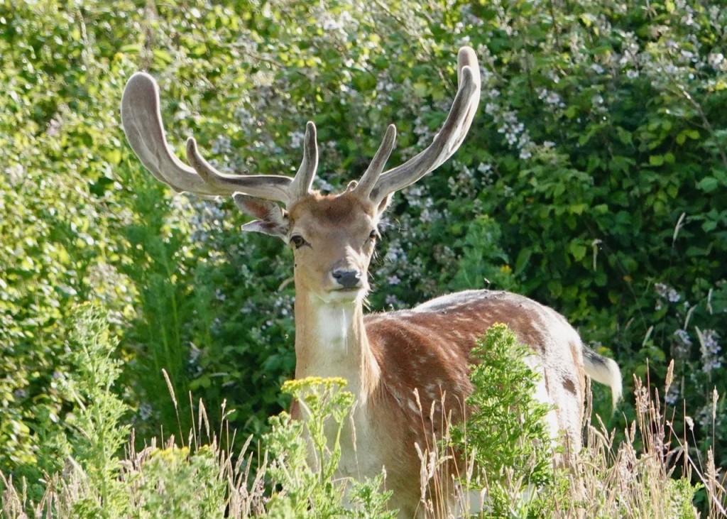At Knepp they have used large herbivores to naturally create different habitats. These include Exmoor ponies; Red; Roe and Fallow deer; Tamworth pigs and English Longhorn Cattle. As you walk the paths it is interesting to see how these have developed with standing dead trees for invertebrates and clumps of bramble which provide nectar for many butterflies including the Comma and safe hideouts for creatures including rabbits. Because the brambles are browsed, they do not take over as can so easily happen with this vigorous plant.