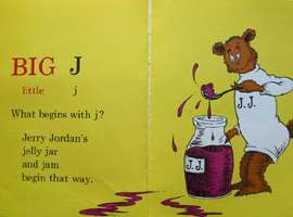 Another technique that is employed with more recent alphabet books is the use of humorous rhyming alliteration. Dr. Seuss's ABC is an excellent representation of this particular technique. Under the letter 'J' it says: