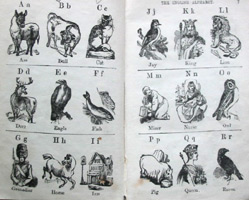 An example of one of these later ABC spellers can be seen in the book 'The English Spelling Book'. Subtitled: "Accompanied by a progressive series of easy and familiar lessons: intended as an introduction to the reading and spelling of the English language". This book incorporates the English alphabet in upper and lower case letters, with mainly animal illustrations; syllables of 2 letters, words not exceeding 6 letters; lessons of 1 syllable; 2 syllables etc. The book also includes different pronunciation, advice to young persons, lessons on grammar and also lessons on the Kings of England and arithmetic.