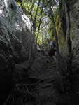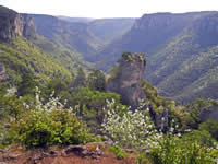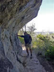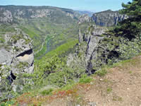 Cliff has found a walk which takes us up along the clifftops above the Vulture Belvedere, the theory being that we can get high enough up to be able to look down on the vultures below us. Fortunately he decides to have pity on me and my ankle and drive up to the top! Well, we turned off the main road at a little village called Le Truel and began the ascent. And what an ascent it is! Mind you, the sign at the bottom did warn of a narrow road on which caravans and motorhomes were forbidden, I suppose that might have given us a bit of a clue. If you don’t have a head for heights (as I don’t believe it or not), this is not the road for you. Narrow, yes, steep, yes. Hairpin bends so tight the truck couldn’t get around in one go. Most took two or three shuffles back and forth and when you are going backwards with a 1000 ft drop behind you, you do not want the brakes to fail! It was so scary I couldn’t even look to take photos! Phew, was I glad when we reached the top, I sincerely hoped that there would be another way down. A different land at the top of these cliffs, undulating grassland, almost flat in places. We made our way to the start of the walk and set off. Well, it wasn’t called the Sentier Des Corniches for nothing. Very soon the path narrowed and we found ourselves on the edge, literally, with drops down of about 500 or 600 ft.