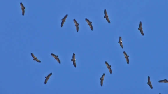 We had always assumed that the migrating birds all head straight for Africa but no, it seems the “Little Brown Jobs” (LBJs), the hard to identify warblers and their brethren do indeed head straight for Africa but the birds of prey come down to the Cape and then head east to cross at Gibraltar to join all their mates with better SatNavs who went straight there in the first place! It is a truly spectacular sight. One day we were sitting at a café and suddenly, immediately overhead and low down, seventy Griffon Vultures appeared, circling lazily in the sky (above). We watched them for about 15 minutes - it was a real privilege to see such magnificent birds so close up.