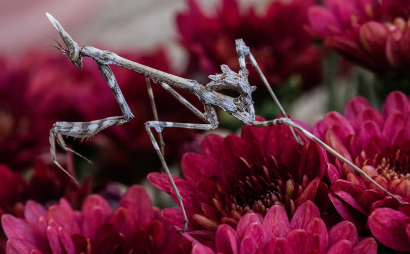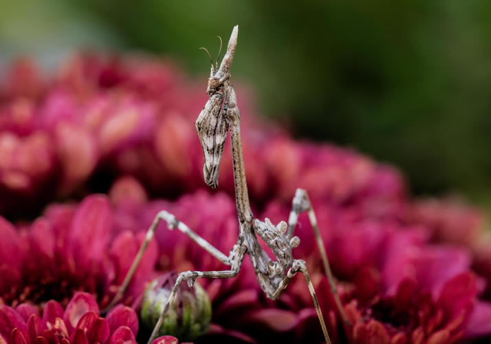 I’ve saved this little visitor until almost last. I happened to look out of the door one day to check if the flowers needed watering and there, on the chrysanthemum, was the most extraordinary creature I had ever seen! I shouted to Cliff to quickly come and look and to bring the camera. I don’t know what he thought he would see but I’m sure it wasn’t this. It is a Conehead Mantis. This amazing creature is a species of Praying Mantis and is found in southern parts of Europe. I love the Praying Mantis because, unlike other insects, it can turn its head, so its eyes can follow you and look directly at you. This one is a baby being only about 40mm long. Adults have wings and the female can be up to 10 centimetres long. I now know where the creators of science fiction films get their ideas for alien monsters!