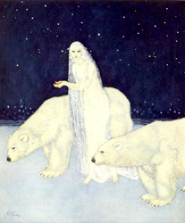 Dulac's generosity was to be observed following the outbreak of the first world war. Hodder & Stoughton approached Dulac and asked him to prepare a compilation of his own favourite artwork for charity. Published in 1915 at the low price of 3/-, Edmund Dulac's "Picture Book For The French Red Cross" made an outright profit of £1,000 for the organisation - about £50,000 today! During the same year every drawing and painting produced by Dulac was undertaken without payment, the money going towards various charities. These charitable works included "The Dreamer of Dreams" and the "Stealers of Light" by Queen Marie of Roumania. The frontispiece of the Snow Maiden in "The Dreamer of Dreams"(below, right) is one of Dulac's most memorable paintings.