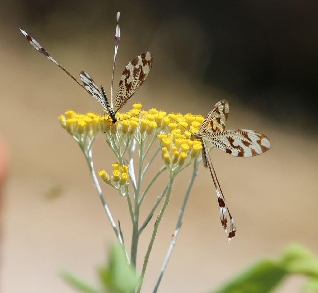 Last but not least, these beauties are spoon-winged lacewings or thread-winged lacewings. The larvae live in the soil and, unlike other lacewing larvae which are predators of ants and other small insects, these feed on vegetable sap. The adults feed exclusively on pollen and nectar and are easily recognized by their ribbon or thread-like rear wings. They really do look like fairies floating from flower to flower.