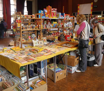 Saturday we arrived at the school at 8am to do a last few bits of preparation. We had bought a computer with us which needed setting up. This allows our customers to view all our stock including other subjects they may be interested in. It also gives visitors the opportunity to view our specialist Rupert website, www.rupertannuals.com, which lists all our Rupert stock as well as providing lots of information on collecting and identifying Rupert books. Thankfully we can get a 3G internet signal at the school - so my first job was to plug in laptop and screen and hang the 3G dongle out the window on a long USB cable! With everything set up there is just time for a quick wander around the other stalls to see if there is anything I might ‘need’ to add to my collection.
