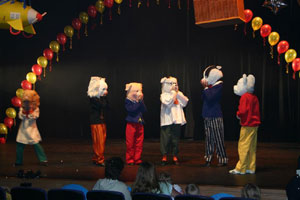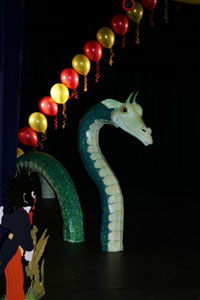 We enjoyed the company of Mary Cadogan who gave us a foretaste of her new book about the women in Rupert's world, with Mary Tourtel, Rupert's creator, of course being the most important. This year's play was "Rupert And Gaffer" and once more the theatre was turned into the world of Nutwood with all Rupert's chums, the Sage of Um in his flying Brella and, making his first appearance, a magnificent sea serpent! (see below).