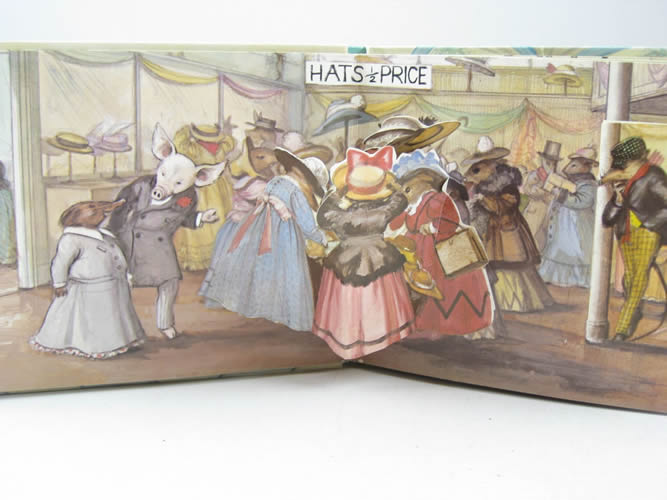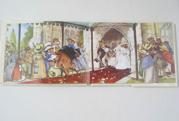 Some of his books are picture books in the true sense of the word as they contain no text. Every child or adult who 'reads' the book would probably tell the story, or interpret the picture, ever so slightly differently picking up on small details which they have noticed but others have missed. Another unusual feature in many of his books are the split pages where each double page spread is divided by a half page which when turned over moves the story on. For example in 'Naughty Nancy', the story of a mouse who is a flower girl at her sister's wedding, a scene shows the bride and groom posing for a photograph in the church entrance, a serene scene of wedded bliss. Turn over the half page and Nancy has burst through between the happy couple, causing the photographer to almost overbalance, the groom to frown and giving the wedding guests a fright. So the scene changes from serenity to chaos in the flick of a page. A whole new picture appears to have been created although the left and right hand half of each full page has remained the same.