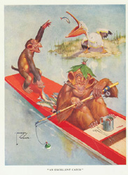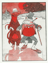 For 6 years, from 1896, Lawson Wood worked for C. Arthur Pearson Ltd., a periodical publisher and this is where he met his wife Charlotte Forge. In the same year as he married, 1902, he decided to turn freelance and was enormously successful. He had work published in well known magazines such as The Strand Magazine, Punch, The Illustrated London News andBoys Own Paper as well as illustrating a number of books. He was an enthusiastic member of the London Sketch Club and was elected a member of the Royal Institute of Painters in Watercolours and exhibited his work in many galleries and at the Royal Academy .