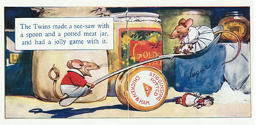 His attention to detail is reflected in a lot of his work and this is why it appeals to me so much. The illustration (above) from Mrs Nibble shows her twins Tony and Tiny on a see-saw made by balancing a spoon on a potted meat jar. Just look at the expression on their faces, sheer pleasure! I love the knot in Tony's tail, the corresponding shadow, the toy left on the floor - forgotten in their enjoyment, all beautifully done.