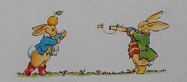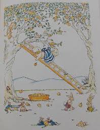 The pictures for this text show an elderly female rabbit dozing comfortably beside a basket full of apples; one rabbit, like William Tell’s daughter, with an apple on his head, while another rabbit carefully aims a wooden pop-gun at the apple; and some of the many Macmouses help to catch apples, while two rabbits use an apple to play football, and Bumble sprawls, rather uncomfortably, high on a long ladder, picking apples and dropping them to a loaded basket, while another pair of mice are trying to use a large saw to slice an apple in half – the apple is about a third as high as a standing mouse. Meanwhile, on the further side of one of the apple trees, a male rabbit is contentedly reading a newspaper.