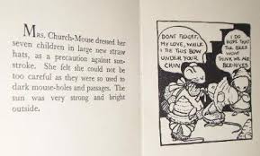 Independently of “Bumble” or Phipps, although also using the well-established Macmice images, Eldon also wrote and illustrated two small-format picture-story books, Tobias (apparently published in 1954), and the “sequel”, Tobias Two (1954). These are simple stories of a young church mouse, Tobias Church-Mouse, a stone-carved angel in the church, and the Church-Mouse family. Judging by the few examples that can be located through internet searches, these two books resemble comic strip stories, with speech-bubbles that add a little to the printed narrative on the facing page. One of these is a nice joke: “I do hope the bees won’t think we are bee-hives”, says one of the young Church-Mouse children, as she dons her straw hat that looks, indeed, like an old-fashioned straw skep bee-hive (the kind of one-use bee-hives used before reusable wooden hives became the standard design).