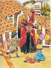 Michael Hague is a much more modern illustrator than Foreman, his first book, an edition of 'East of the Sun West of the Moon' (Harcourt Brace) was published in 1980 with his renowned edition of 'Wind in the Willows' (Holt) following in the same year. Hague is an American illustrator, born in Los Angeles in 1948. His early work is now worth anything up to £80 and is very sought after. However, he is still busy and his newer works are readily available and going up in value rapidly. One of my favorites is 'The Rainbow Fairy Book' (William Morrow, 1993) this is actually edited by Andrew Lang and is a collection of wonderful fairy tales selected and illustrated by Hague, already worth about £30. The picture on the right here is taken from that book, specifically from 'Hansel and Gretal'.