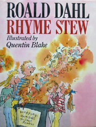 Left: Cover illustration of Roald Dahl's Rhyme Stew (bearing the warning 'not for small readers')