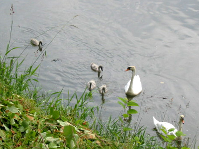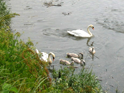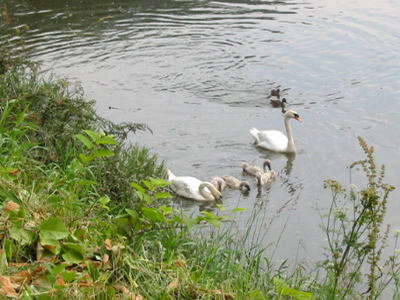 Below are some photographs of the new cygnets accompanied by their proud parents on the River Wye outside Stella Books (June 2006):-