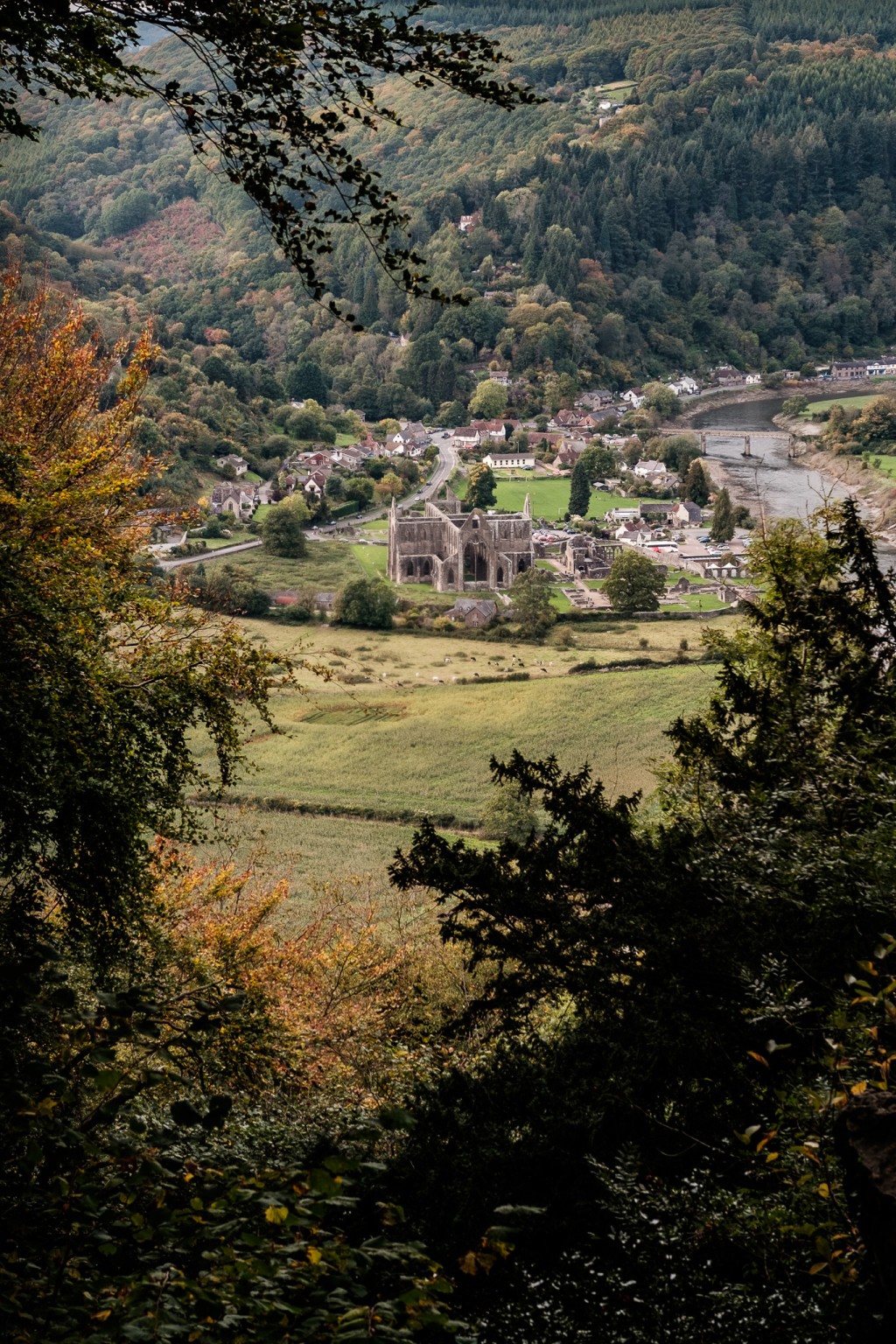 Here we find the flat plateau of rock named the Devil’s Pulpit.  It is possible to climb up onto the rock and view the valley below, dominated by the ruins of the 12th century Abbey. In the hollow behind the rock lies an ancient yew tree, its roots grown into and around a pile of stone. Legend holds that from this plateau, the devil would taunt the monks and occupants of Tintern Abbey below, hence the name.