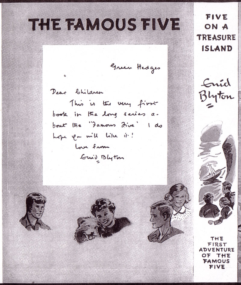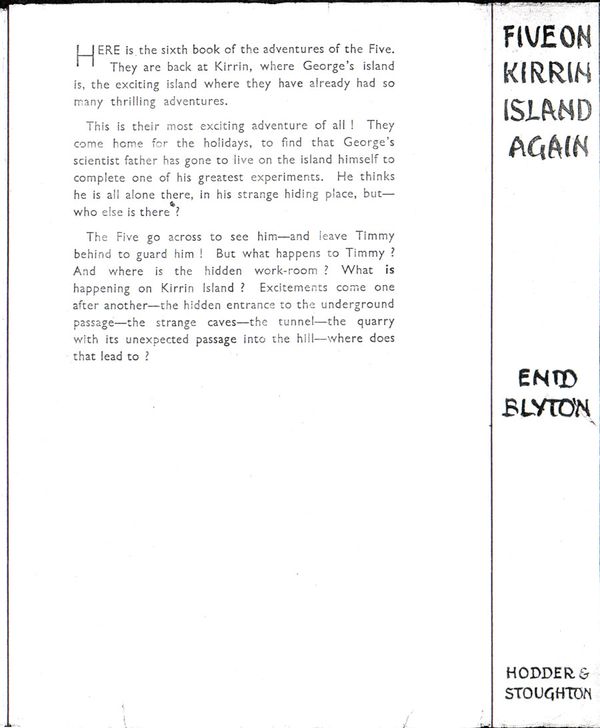 The spine is illustrated and the title number is printed in word form at the tail end. The FF are illustrated on the rear panel below a facsimile letter from the author. See Figure5 - Five On A Treasure Island 8th Imp. 1951. This style of dustwrapper was used on all first editions from 1951 (title 10) to the end of the series and on numerous reprints up to 1966 when Brockhampton took over as publishers.