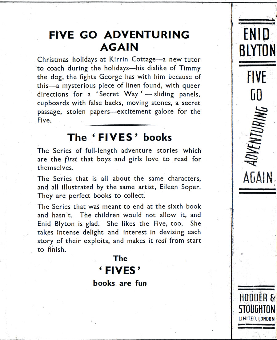 The spine is again plain but the text on the rear panel consists of 2 blocks separated by a horizontal bar. See figure 3 below: Five Go Adventuring Again 3rd impression 1948. This dustwrapper was used between 1948 and 1951 on 3 first editions (titles 7-9) and 23 reprints. Note that for the first edition and first reprint of Five Fall Into Adventure an illustration was added to the spine. This was in effect a transition between old and new-style dustwrappers. See figure 4 - Five Fall Into Adventure.