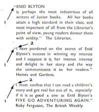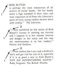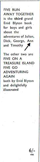 Compare the height of the inverted commas (arrow 1) and the position of the letter 'I' (arrow 2) in the diagrams above. Note the differences. While these were the only 2 dustwrappers with these same 3 paragraphs on the rear panel, the first 2 paragraphs were also used on 3 other dustwrappers (Five Go Off In A Caravan 1st ed. 1946, Five On A Treasure Island 4th imp. 1947 and Five Go Adventuring Again 2nd imp. 1947). On the latter 3 dustwrappers the height of the inverted commas and the position of the letter 'I' is the same as that on Five Go To Smuggler's Top above. This means that 2 details on the Five Run Away Together dustwrapper are inconsistent with the other 4 dustwrappers.