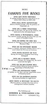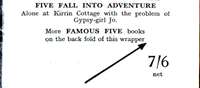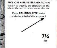 On the above the words More FAMOUS FIVE books on the back fold of this wrapper were printed at the bottom of the front flap. Note the inconsistency of the punctuation mark used after the word wrapper on the following examples: