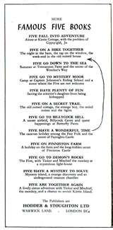 It should not go unnoticed however, that having provided detailed text on both flaps of DB dustwrappers to advertise other Famous Five titles, H and S continued to do this on new-style dustwrappers despite having dispensed with the full text rear panel. With sales promotion always a prime consideration this is hardly surprising.