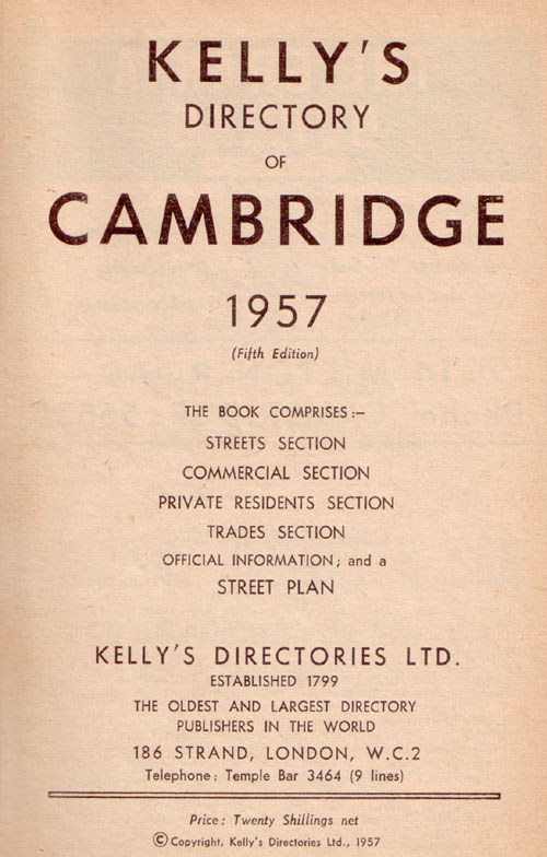 Kelly's Directories was established in 1799 and boasted the slogan "The Oldest and Largest Directory Publisher in the World". Frederic Festus Kelly took over the production of the Post Office London Directory in 1835 and by 1845 Kelly had managed to produce provincial directories which eventually covered every town and village of Great Britain . The majority of the directories continued in annual production until the early 1970's, by which time the telephone had become widespread and with it the telephone directory. The format of production of Kelly's trade directory changed little over all this time and now we will have a look at it section by section.