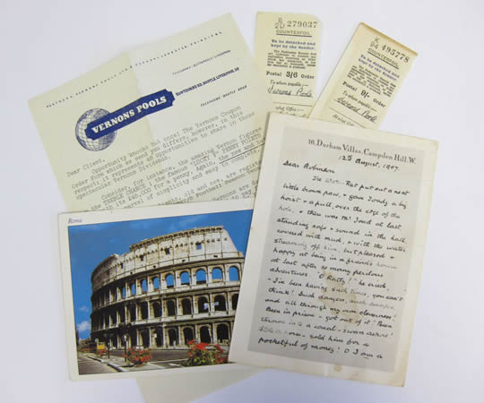 Secondly, a postal order counterfoil dated 13/11/1947. The postal order was for three shillings and sixpence and sent to Vernons Pools. I can only assume that, sadly, the purchaser did not manage to scoop the jackpot because later in the same book I found another counterfoil dated 16/12/1948 again to Vernons Pools for nine shillings! A few pages further on I came across a standard letter from Vernons Pools about Coupon order forms. The final paragraph talks about there still being a paper shortage and the need to order your coupons so that 'your interests are safeguarded for what promises to be a record season'. Scribbled on the back appears to be some sort of calculation, possibly related? Does the 13 months between the dates on the counterfoils indicate that this was someone who took their time reading, or did they hide the evidence of their gambling in a book that they thought no-one would read!?
