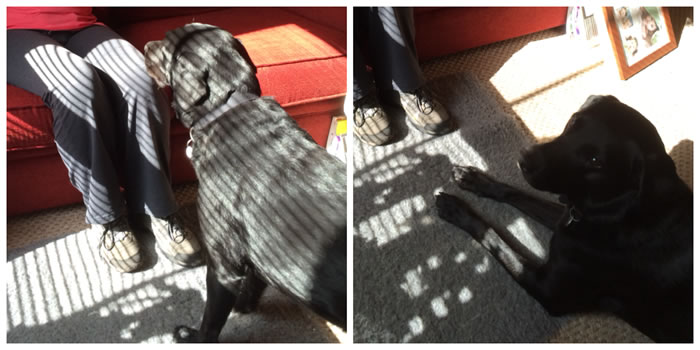 Above: 1. Betsy alerting me and 2. Betsy laying down after I have asked "What is it", so that I know it is an emergency alarm!