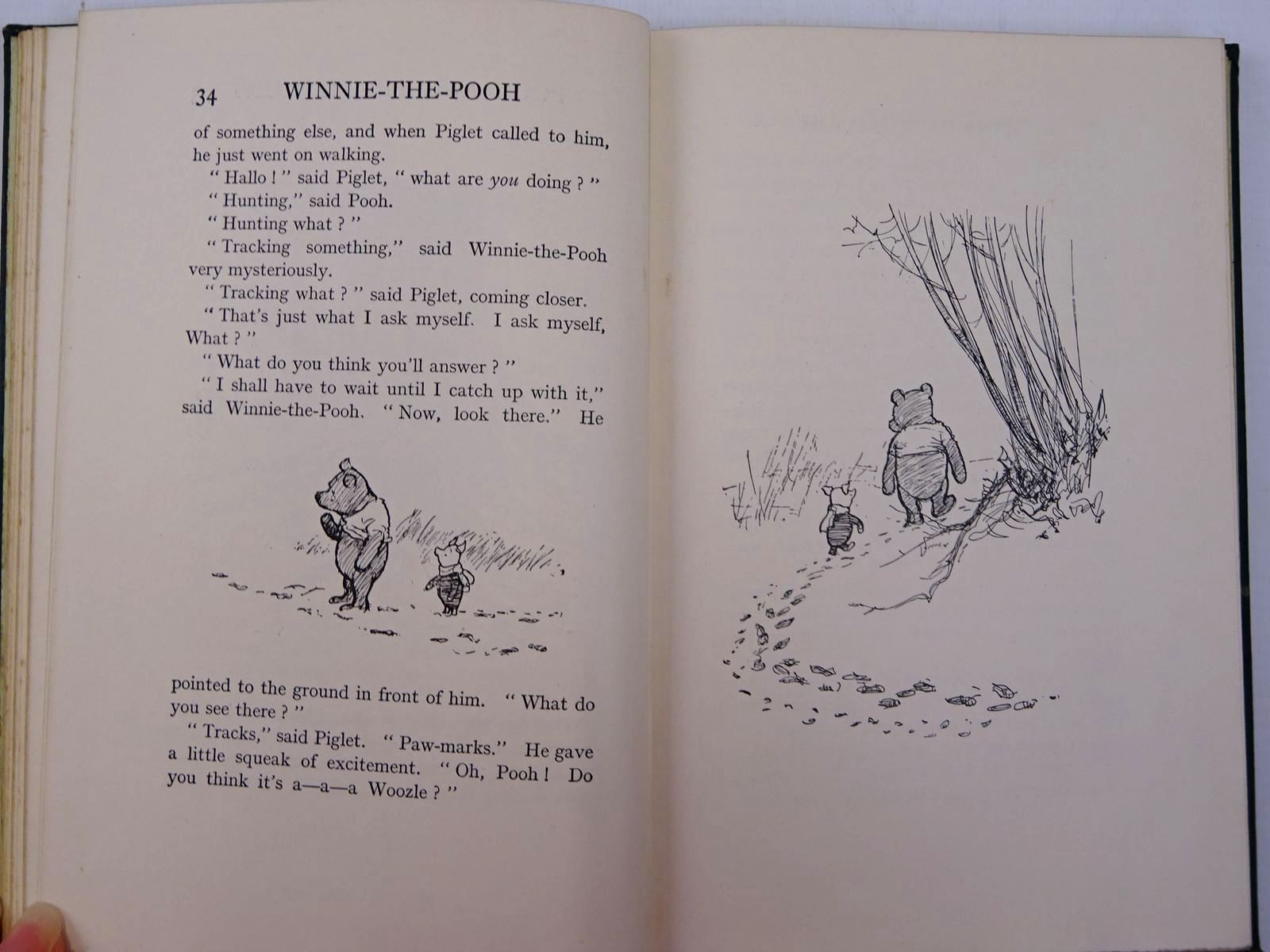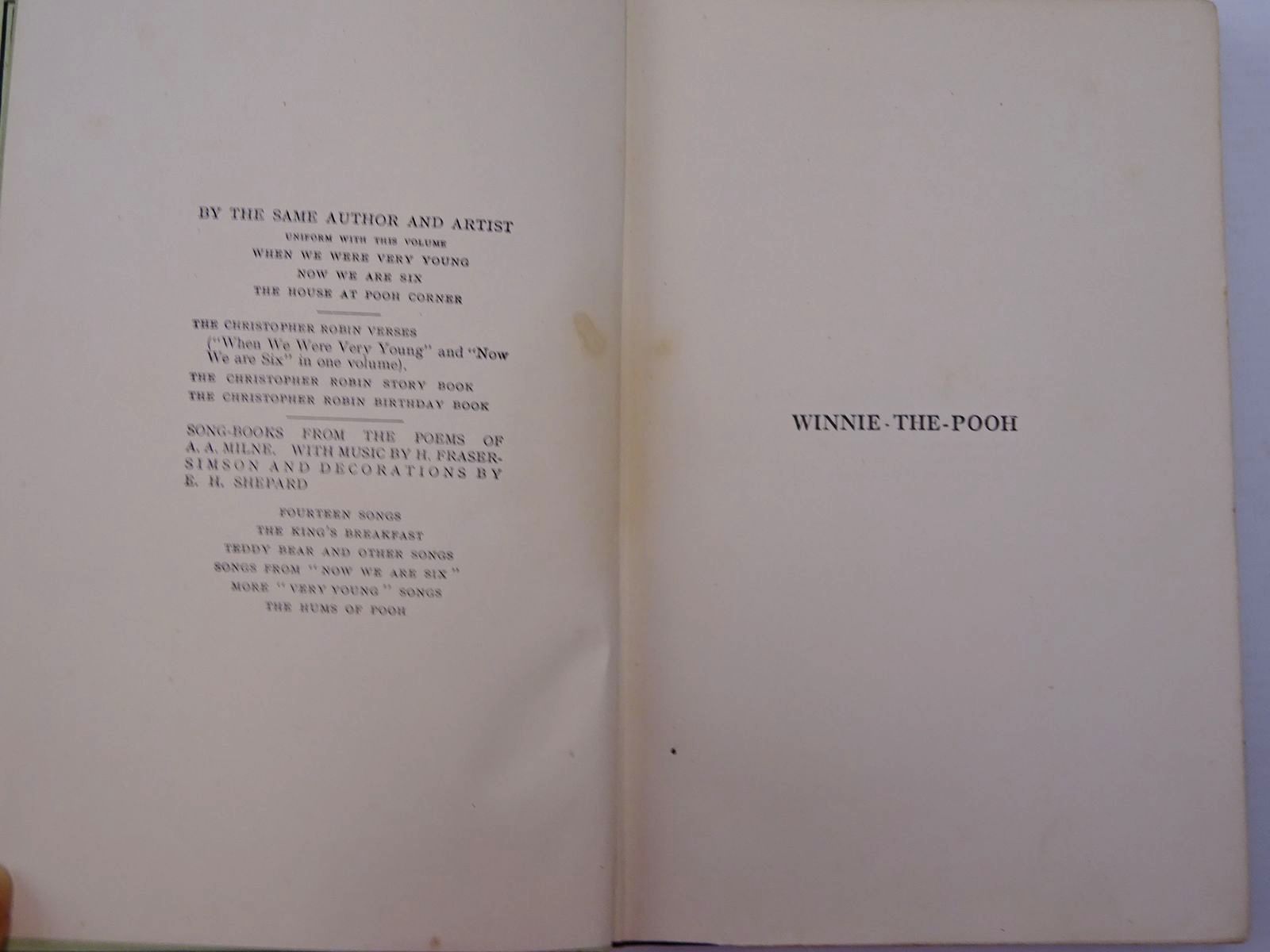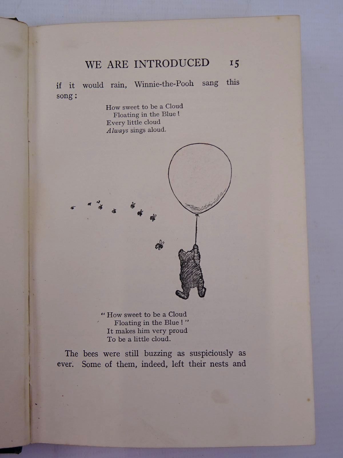 Almost very good condition. Dark green cloth, gilt titles to spine, gilt border and vignette to front cover. Pictorial endpapers. Top edge gilt. Absolutely delightful b/w illustrations of Pooh Bear and friends. A children's classic.