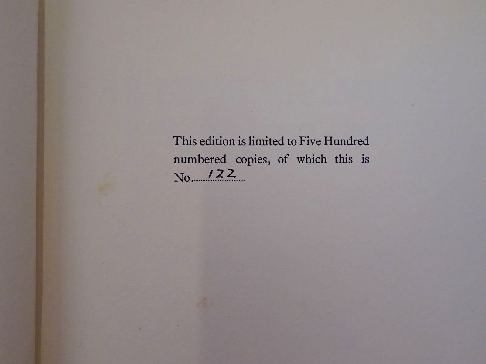 This is Copy Number: 122. Foxing to endpapers, outer page edges and a few page margins. Wrapper is a bit browned with a few closed tears, which have been neatly repaired with tape to verso. A few marks to wrapper.