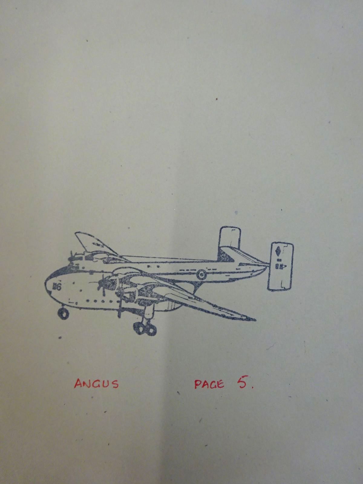 Rubber ink stamp of aircraft and 'Angus Page 2' below in red ink to front endpaper and also name & address in ink- very neat. Top edge of text block lightly foxed. Pictorial dustwrapper is a little grubby with 3" loss to top of spine.