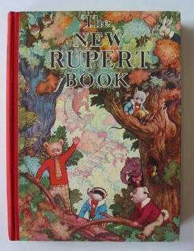 The third Rupert annual. 1st story Rupert and the Daffodils. Colour pictorial boards. Red cloth spine. 126 pages. 10x7.5". Covers are edge worn, spine and corners bumped. Front joint is almost broken. Name and address in ink in belongs to box. Margin tear to base of title-page. Some page corner tips creased. Hinges cracked, some very weak, because of cracked joints/hinges front cover doesn't sit as is should. Some grubby fingermarks to page margins.
