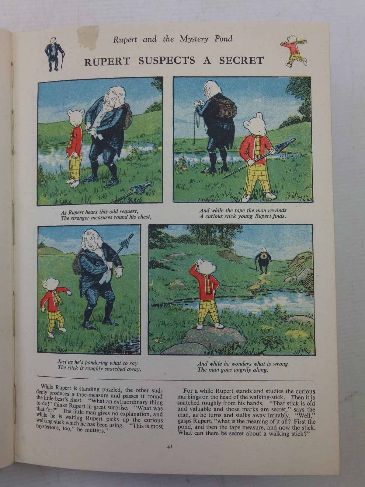 Slightly better than very good condition. The last hardcover annual to be published during the war years and widely considered to be the best Rupert annual ever. Front cover shows Rupert holding a paddle and waving while Algy looks on from a little boat. First story Rupert and the Red Egg. 118 pages.