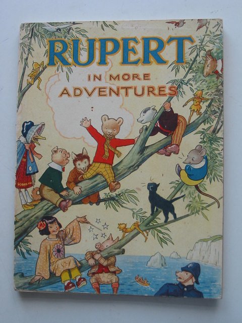 Pictorial card wraps showing Rupert with chums, waving from a tree. First story Rupert and Rollo. 119 pages. 9.5 x 7 inches. Spine slightly worn with small nicks at top and tail. Creases to lower corner of front panel. Name and address in ink to belongs to box, child's writing in ink to inside front cover. Foxing to textblock. Some lower page corner tips creased.