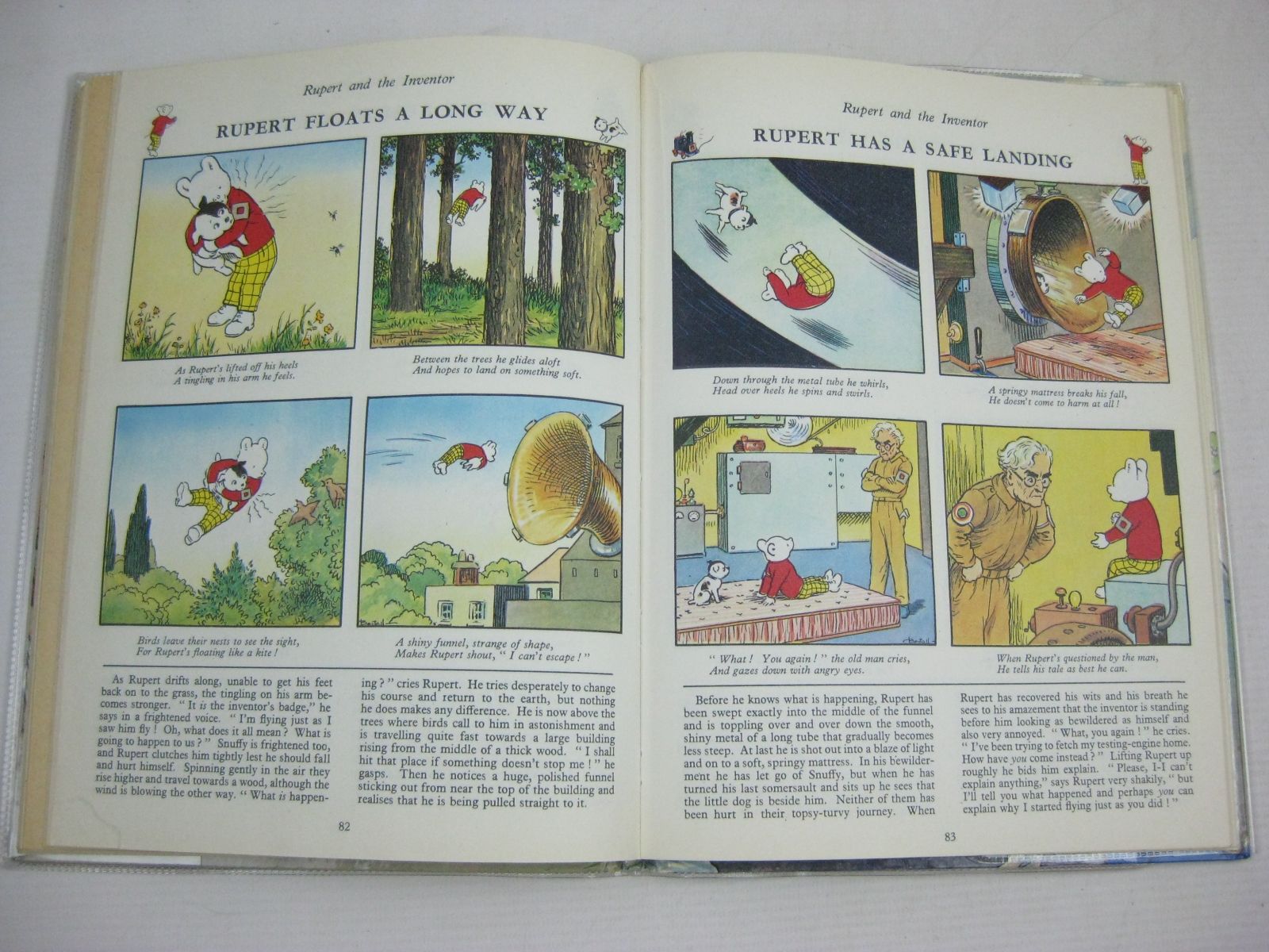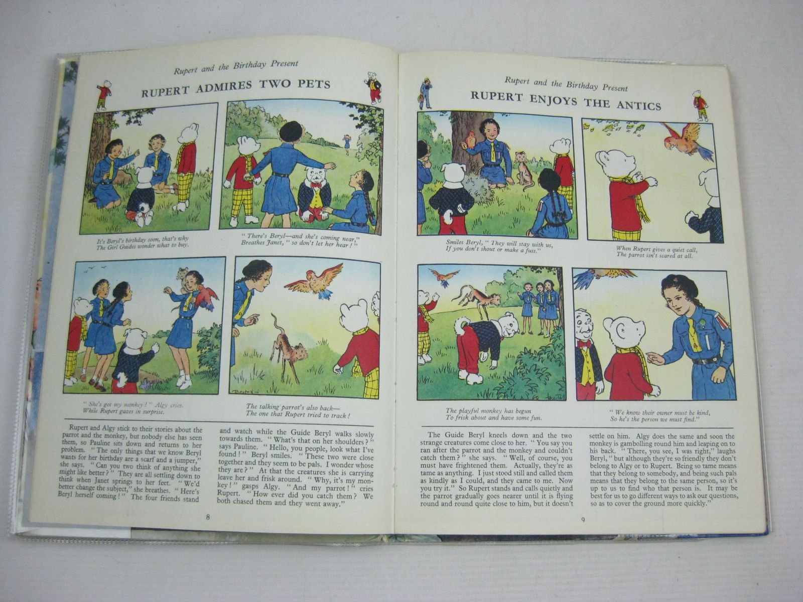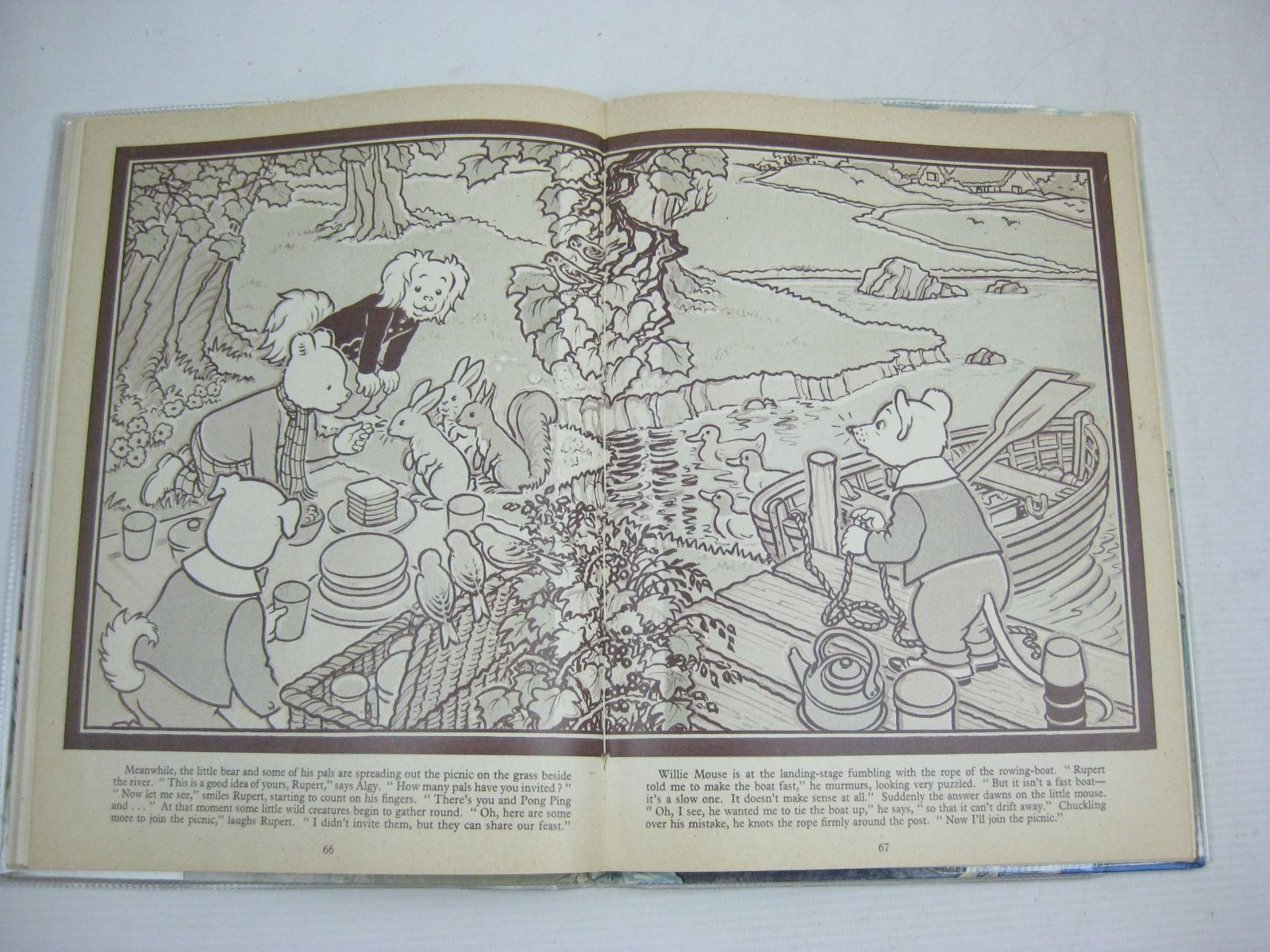 Very good condition. Laminated pictorial boards showing Rupert sitting on a rock having just caught a Merchild in his fishing net. 1st story Rupert and the Birthday Present. 115 pages.