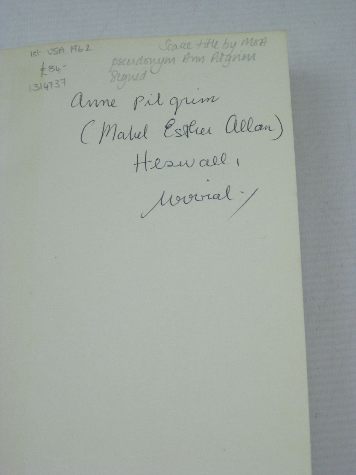 SIGNED by the author (Anne Pilgrim and Mabel Ester Allan used) to front endpaper. Spine bumped with fading to top and tail. Small mark to lower corner of front cover and tiny bump at lower edge. There are some light marks to page margins and textblock is ever so slightly grubby. Dustwrapper is browned to spine and also slightly worn at top and tail of spine (minimal loss). The wrapper does look as though it is 5mm too short for the book but does not appear to have been trimmed so I believe this is how it was produced.